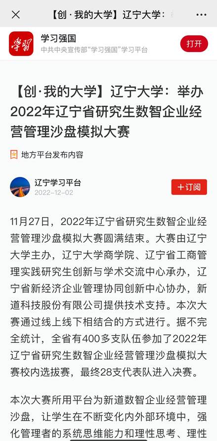 m体育(中国)有限公司官网承办的2022年辽宁省研究生数智企业经营管理沙盘模拟大赛报道荣登“学习强国”平台。