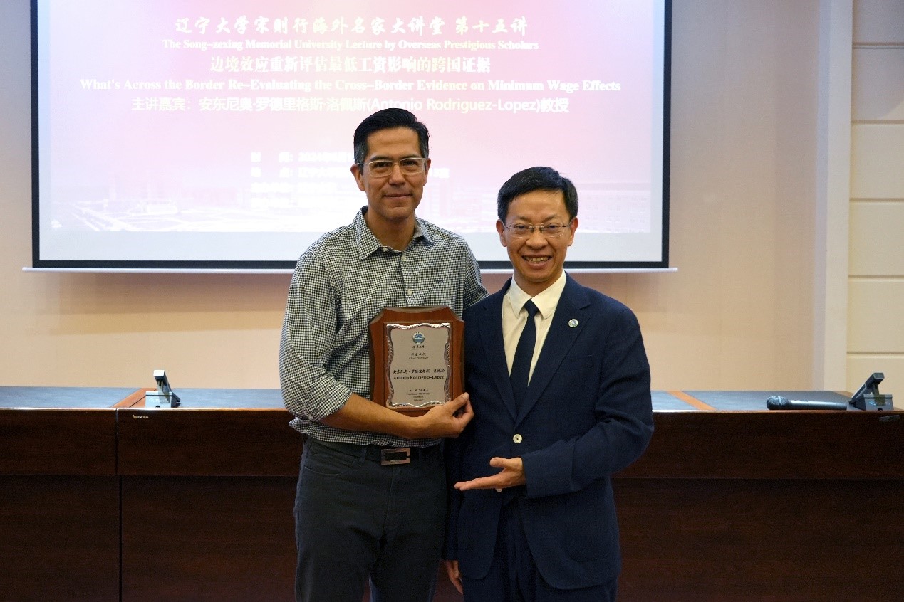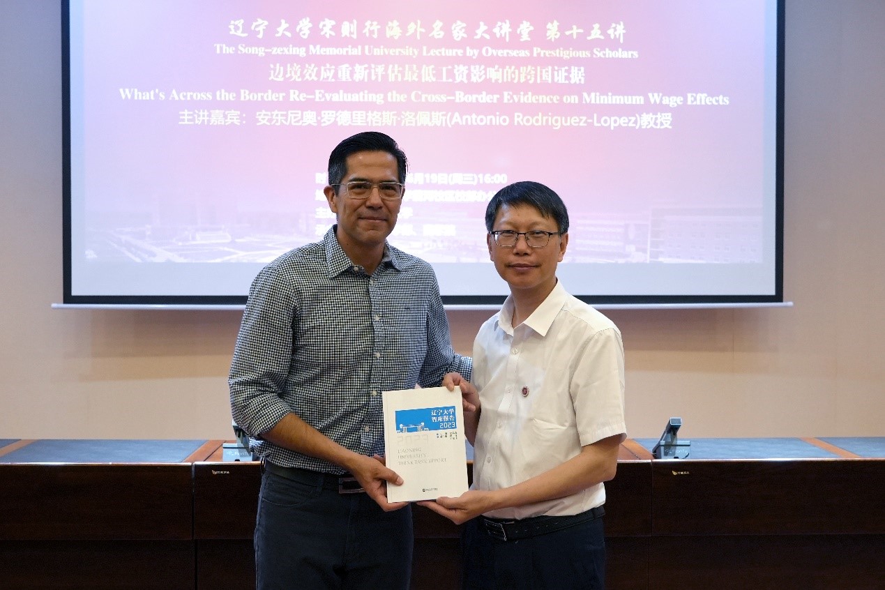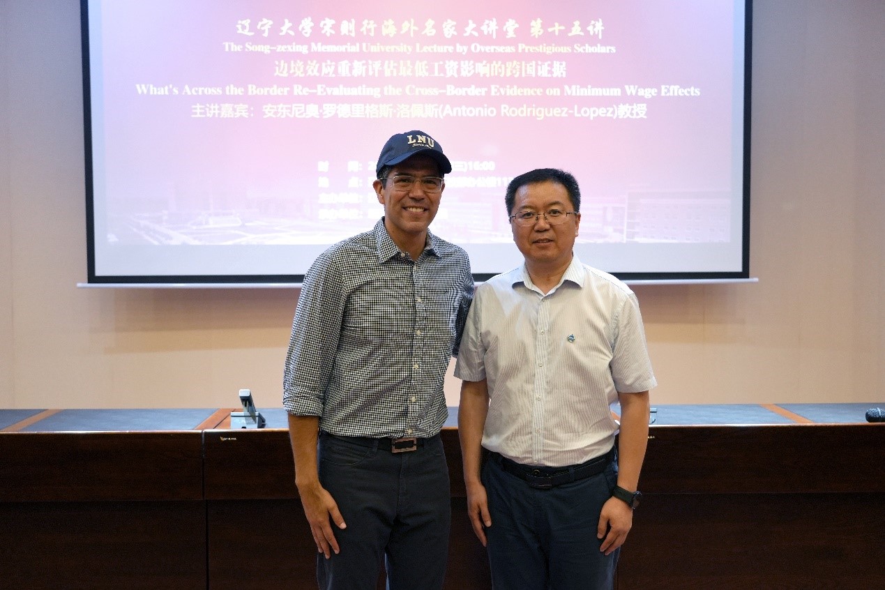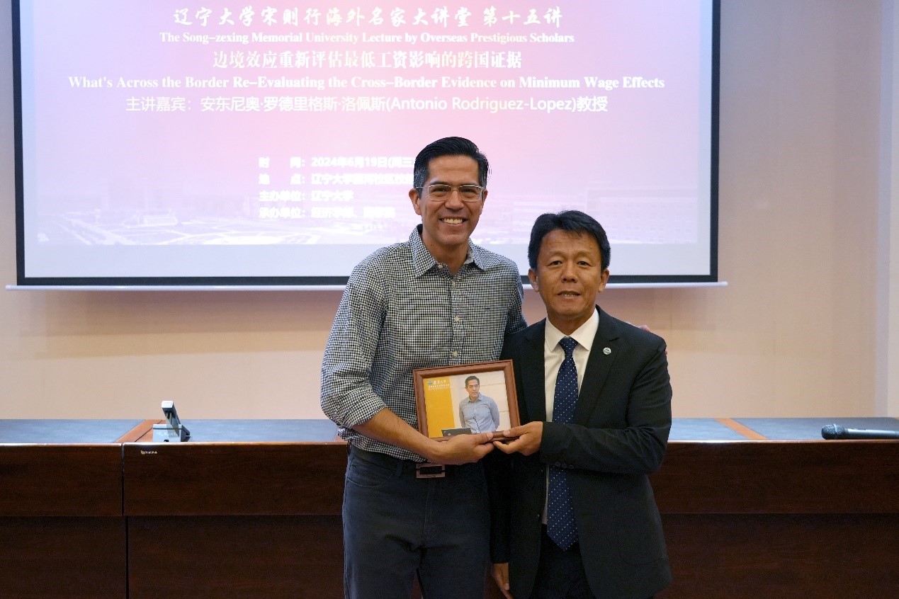 6月19日下午,由经济学部、商学院承办的辽宁大学宋则行海外名家大讲堂(第十五讲)在辽宁大学蒲河校区校部办公楼113室举行。加州大学欧文分校安东尼奥・罗德里格斯・洛佩斯教授应邀作了题为《What's Across the Border? Re-Evaluating the Cross-Border Evidence on Minimum Wage Effects》的学术报告。辽宁大学党委副书记、校长余淼杰教授出席大讲堂并进行了嘉宾介绍。辽宁大学副校长仇焕广教授主持讲座。经济学部120多位师生参加了讲座活动。