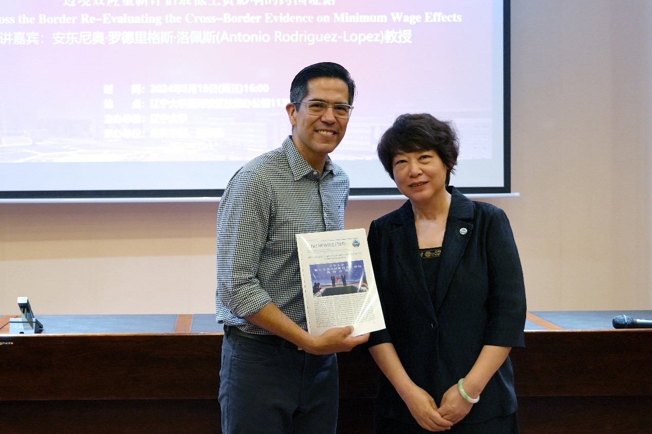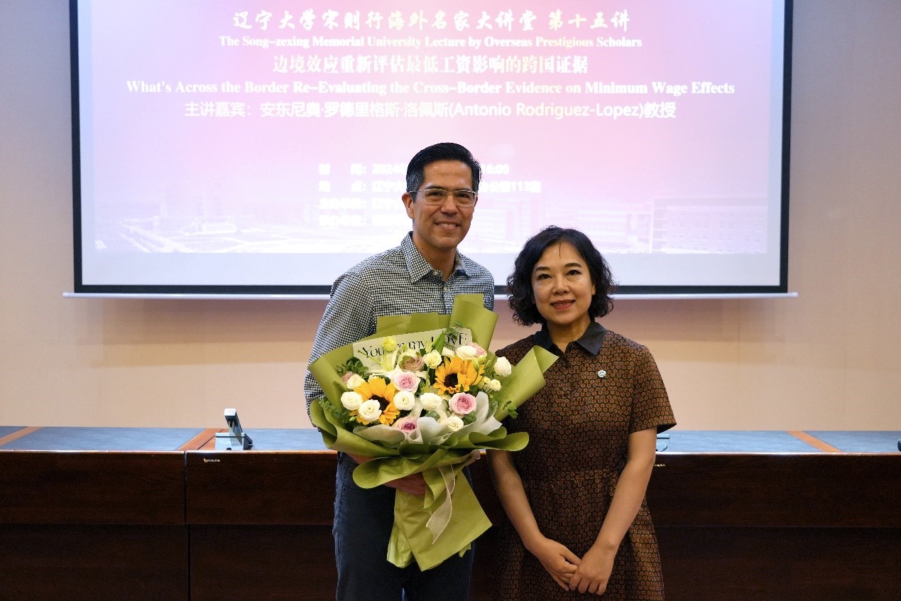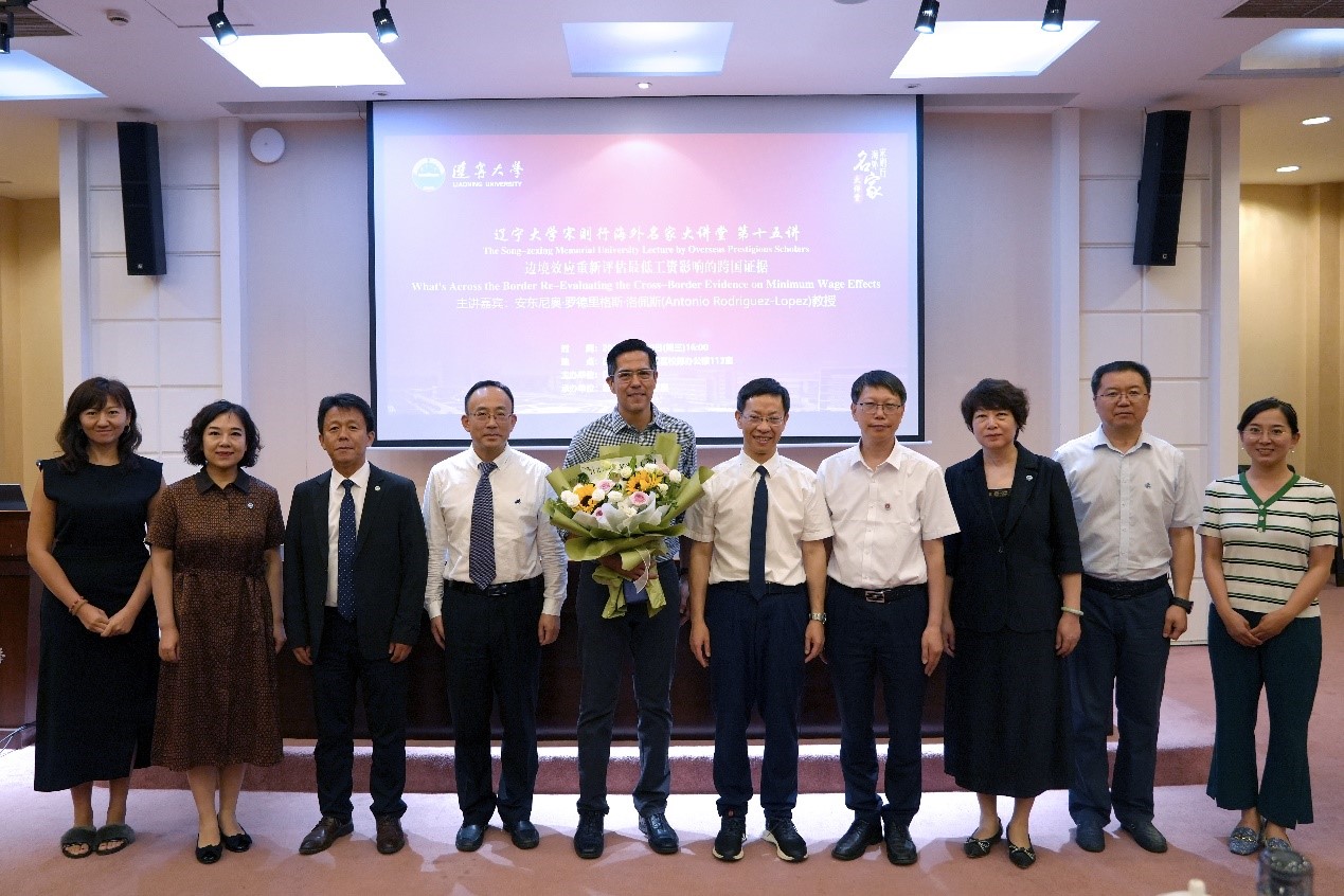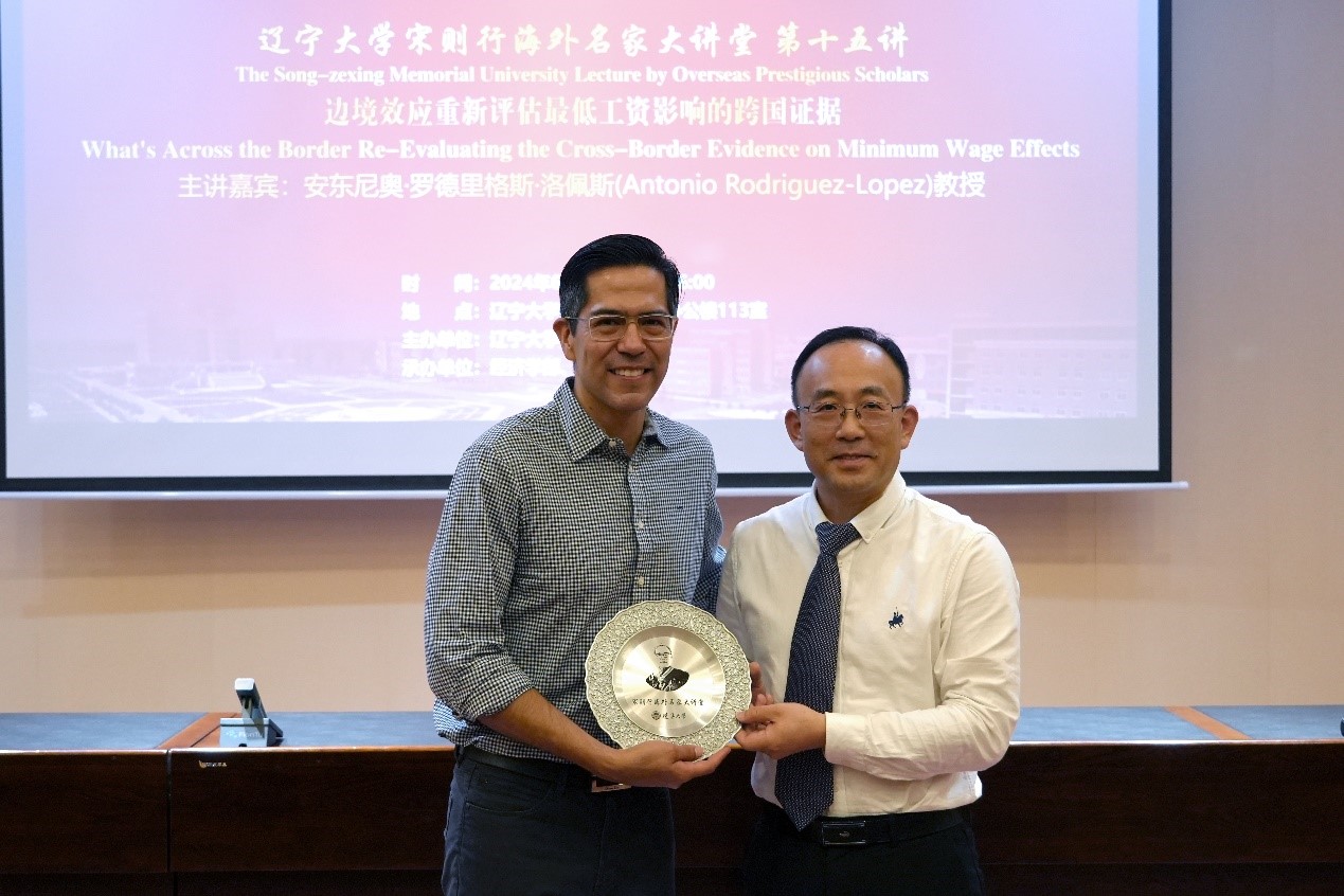 6月19日下午,由经济学部、商学院承办的辽宁大学宋则行海外名家大讲堂(第十五讲)在辽宁大学蒲河校区校部办公楼113室举行。加州大学欧文分校安东尼奥・罗德里格斯・洛佩斯教授应邀作了题为《What's Across the Border? Re-Evaluating the Cross-Border Evidence on Minimum Wage Effects》的学术报告。辽宁大学党委副书记、校长余淼杰教授出席大讲堂并进行了嘉宾介绍。辽宁大学副校长仇焕广教授主持讲座。经济学部120多位师生参加了讲座活动。