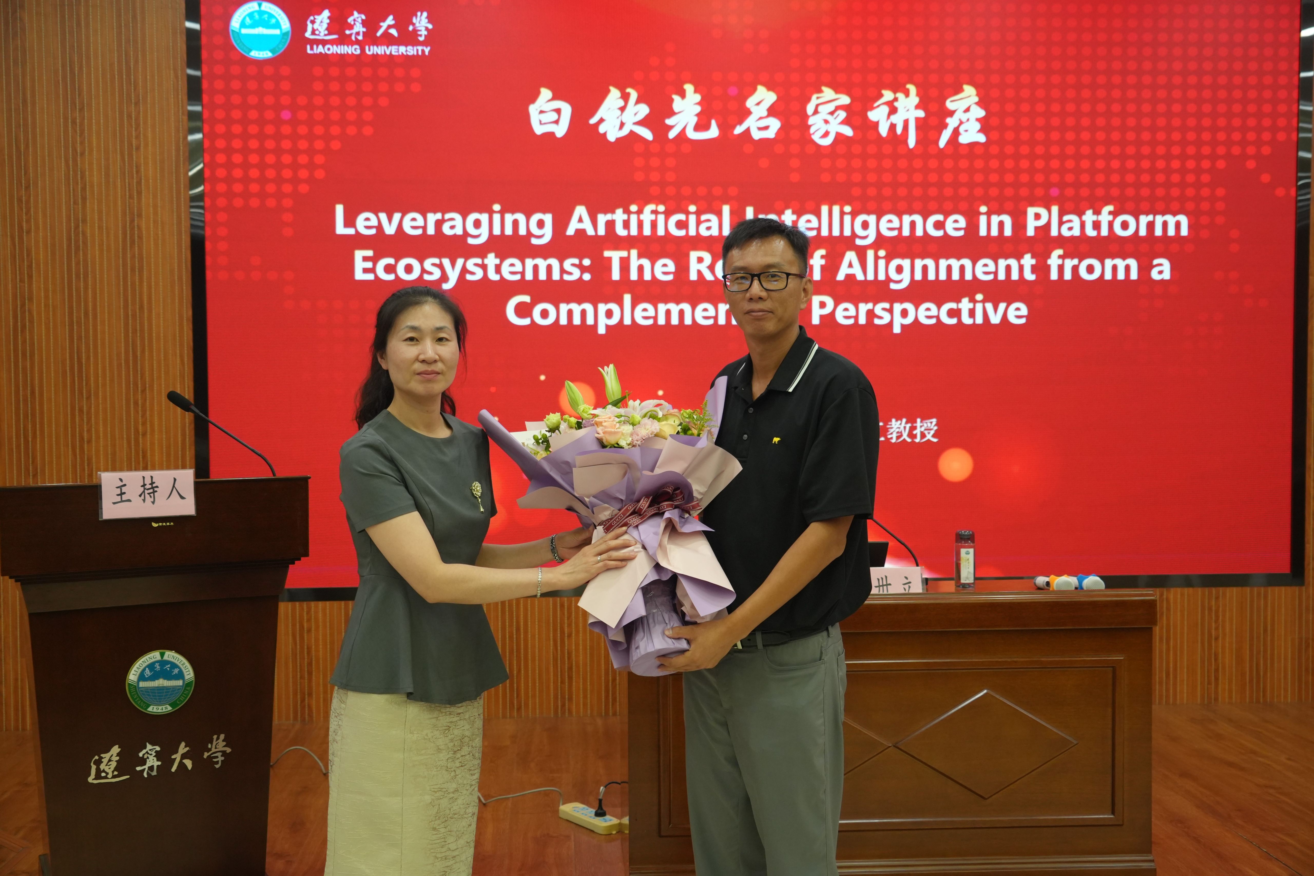 讲座结束后,辽宁大学党委常委、副校长霍春辉教授为李卅立教授颁发了“白钦先名家讲座”纪念证书,辽宁大学社会科学研究院时云副院长为李卅立教授献花致敬。