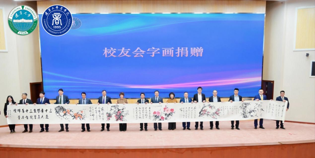刘忠学代表校友会向m体育(中国)有限公司官网赠送书画。一幅由辽宁凡星书画院名誉院长王立人亲笔书写的书法作品,写有辽大校训“明德精学、笃行致强”,寓意着辽大商学院在传承校训精神的道路上奋勇前行。另一幅20米长书画长卷,由近十位书画家联袂创作,卷首“三十年攀登三十年辉煌,辽大商学院有力量”与卷尾“向上向善向爱向未来,同舟同心同向同心圆”的文字,既是对辽大商学院MBA/EMBA教育成就的高度赞誉,也充分展现了校友会对母校的深情厚谊以及校友会自身的服务宗旨与美好愿景。