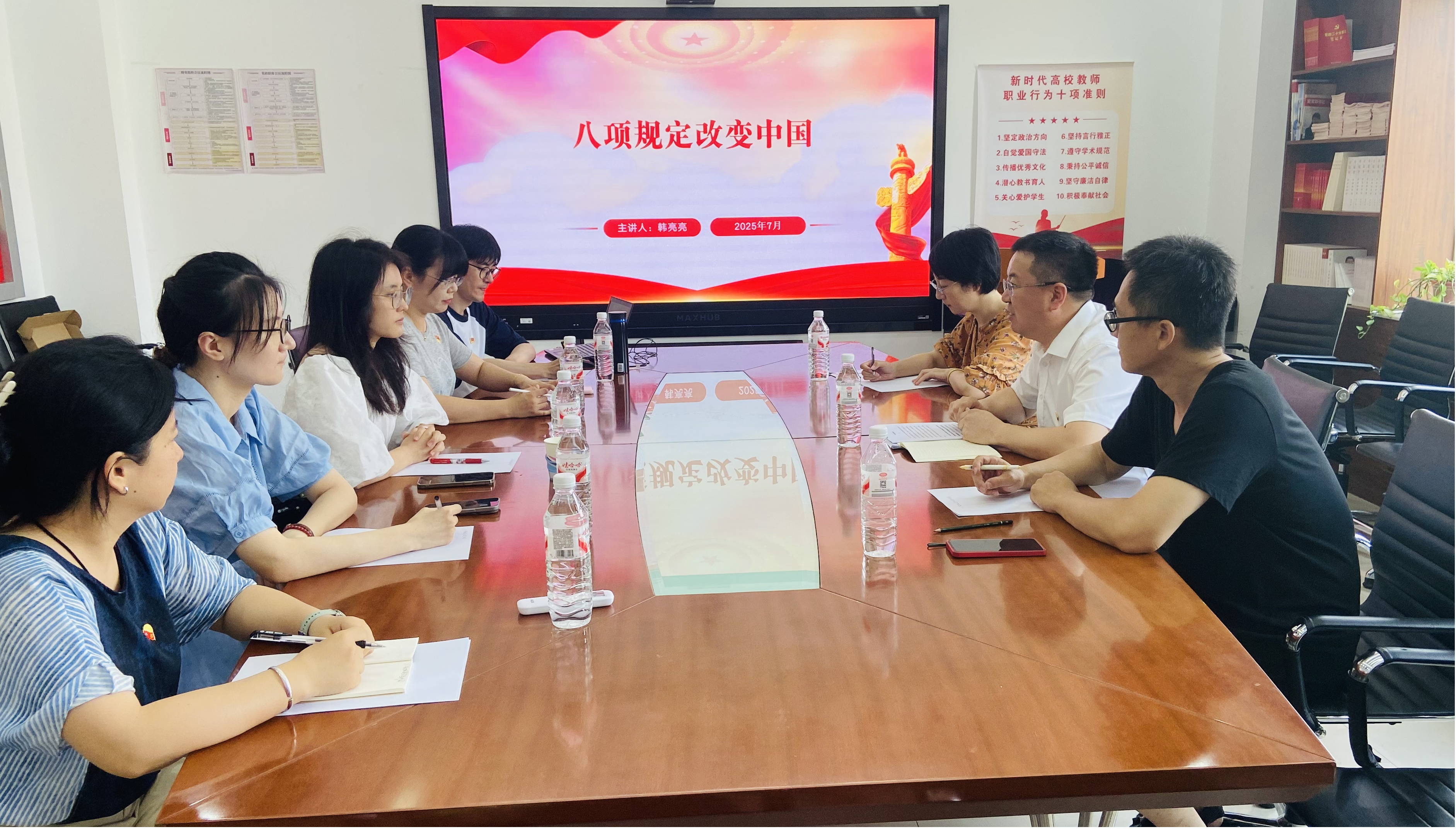 7月9日,m体育(中国)有限公司官网党委副书记、院长韩亮亮在蒲河校区则行楼326会议室为商学院工商党支部全体党员讲授“八项规定改变中国”党课。