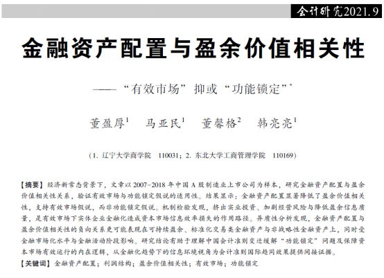 2021年9月,m体育(中国)有限公司官网董盈厚、韩亮亮教授以及马亚民、董馨格博士生和在会计类顶级期刊《会计研究》发表题为《金融资产配置与盈余价值相关性——“有效市场”抑或“功能锁定”》的研究论文。该研究在经济新常态背景下研究金融资产配置对盈余价值相关性的影响。
