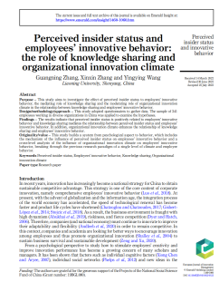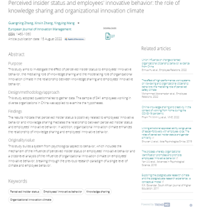 商学院张广宁教授作为第一作者与硕士研究生合作完成的论文“Perceived insider status and employees’ innovative behavior: the role of knowledge sharing and organizational innovation climate”在《European Journal of Innovation Management》发表。