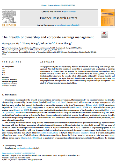 商学院徐业坤教授作为通讯作者的合作论文《The breadth of ownership and corporate earnings management》在国际知名期刊《Finance Research Letters》发表。