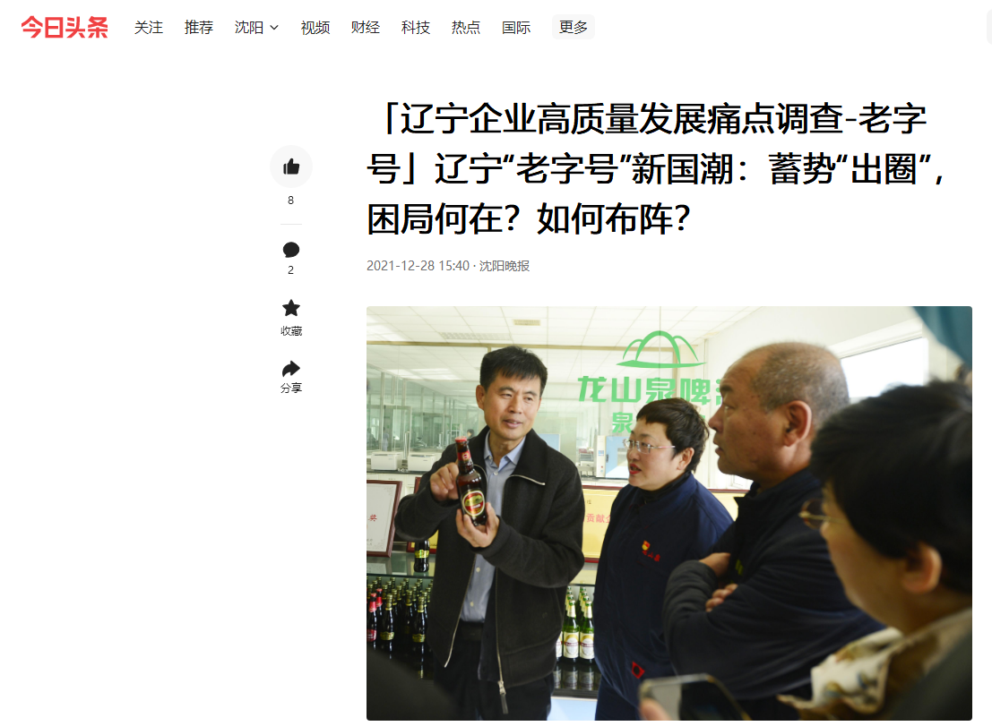 兰宠印凝视着手里的“龙山泉”出神。在沈城,“嗦啰鸡架喝龙山泉啤酒”,正在成为饭店食客的标配。可是,“龙山泉”如何走出辽宁,成为全国叫响的品牌?作为“龙山泉”掌门人的兰宠印,一直在苦苦探索。11月以来,由中国企业改革发展研究院、m体育(中国)有限公司官网、辽商总会、辽宁省委党校经济管理研究中心、沈阳日报社组成的辽宁经济全面振兴调研组,走进龙山泉等多家辽宁知名“老字号”企业。当下,新国潮下全国各地“老字号”劲掀上市潮,“老字号”焕发勃勃生机。辽宁“老字号”高质量发展困局何在?如何“出圈”?针对”老字号”痛点,调研组开药方、献良策,助推品牌升级和振兴。